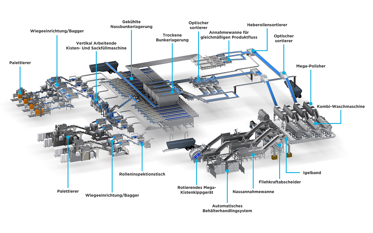 Wenn Größe und Präzision wichtig sind, werden die Konfigurationsoptionen, die in diesem Beispiel einer 45-Tonnen-pro-Stunde-Linie verfügbar sind, zu einer Notwendigkeit. Es werden drei Annahmesysteme gezeigt, darunter eine traditionelle LKW-Waschanlage, ein Behälterkipper und ein automatisches Behälterhandlingsystem. In jedem Fall werden die Möhren schonend in Wet Hoppers angenommen, eingeweicht und dann zum Hedgehog Top Remover gehoben, bevor sie entsteint werden. Eine kurze Rinnenstrecke befördert die Ware direkt in die Mega-Polisher, wo sie dann poliert wird. Anschließend werden die Möhren mechanisch und optisch in die gewünschten Qualitäten sortiert. Anschließend werden sie in gekühlten Nassbunkern (oder in Trockenbunkern) gelagert, bevor sie einer Endkontrolle unterzogen und kommerziell verpackt werden, entweder in Produktbehälter über einen vertikalen Behälterfüller oder mittels eines integrierten Wiege-, Absack- und Palettiersystems.