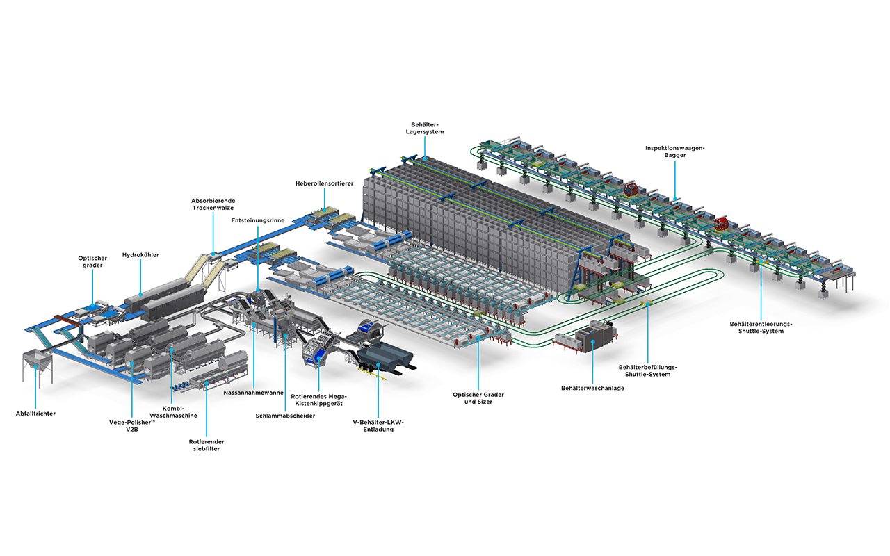 Diese 90-Tonnen-Kartoffellinie demonstriert den Umfang und die Komplexität, die für die Verarbeitung und Handhabung großer Mengen von Produkten erforderlich sind. Die Annahme erfolgt über große Lagerbehälter oder direkt von den Erntefahrzeugen. Die Kartoffeln werden dann eingeweicht, entsteint, gewaschen und poliert. Ein großes Rinnennetzwerk sorgt in dieser Phase für die Transportlösung, unterstützt durch ein großes Rotary-Filter-Wasserrecycling-System. Die Kartoffeln werden dann über einen ersten optischen Sortierer zu einem Paar Hydro-Cooler befördert. Das Kühlen von Kartoffeln ist eine bewährte Methode, um die Haltbarkeit zu verlängern, und in diesem Beispiel werden die gekühlten Kartoffeln durch die Kombination eines mechanischen Hubrollensortierers mit einem optischen Sortier- und Größensortiersystem für maximale Präzision präzise sortiert.