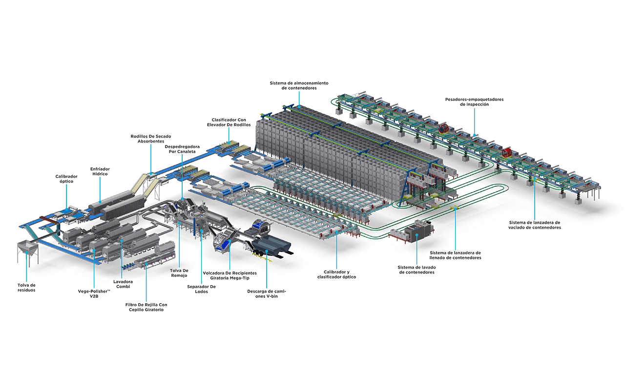 Esta línea de patatas de 90 toneladas demuestra la escala y la complejidad necesarias para procesar y manipular grandes volúmenes de productos. La recepción se gestiona a través de grandes contenedores de almacenamiento o directamente desde los camiones de cosecha. A continuación, las patatas se remojan, se deshacen, se lavan y se pulen. Una gran red de canales proporciona la solución de transporte en esta fase, con el apoyo de un gran sistema de reciclaje de agua con filtro rotatorio. A continuación, las patatas se transportan, a través de una clasificadora óptica inicial, a un par de hidroenfriadores. El enfriamiento de las patatas es una metodología probada para prolongar su vida útil y, en este ejemplo, las patatas enfriadas se clasifican con precisión mediante la combinación de una clasificadora mecánica de rodillos elevadores con un sistema de clasificación y clasificación óptica para obtener la máxima precisión.
