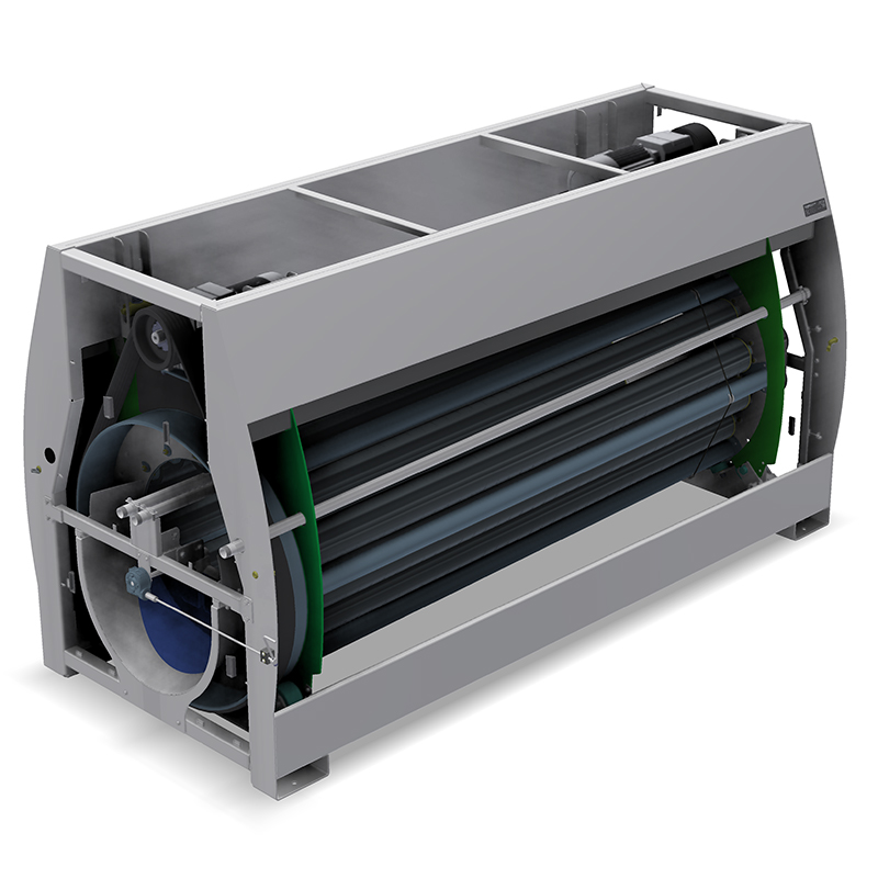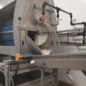 Nuestro Vege-Polisher™ V2B posee un tambor rotativo compuesto por filas de cepillos de nailon. Las hortalizas ingresan a través de un conducto de entrada grande. Dos tuberías de agua rocían agua dulce o reciclada sobre las hortalizas mientras se trasladan a través del tambor. Las hortalizas se lavan y pulen al frotarse con otras hortalizas así como con los cepillos rotativos.