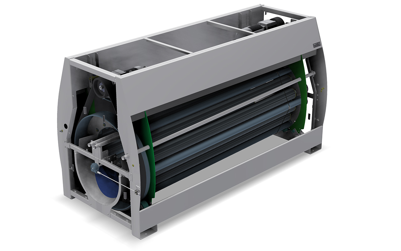 - Barras de pulverización de agua fresca y agua reciclada en el interior del tambor