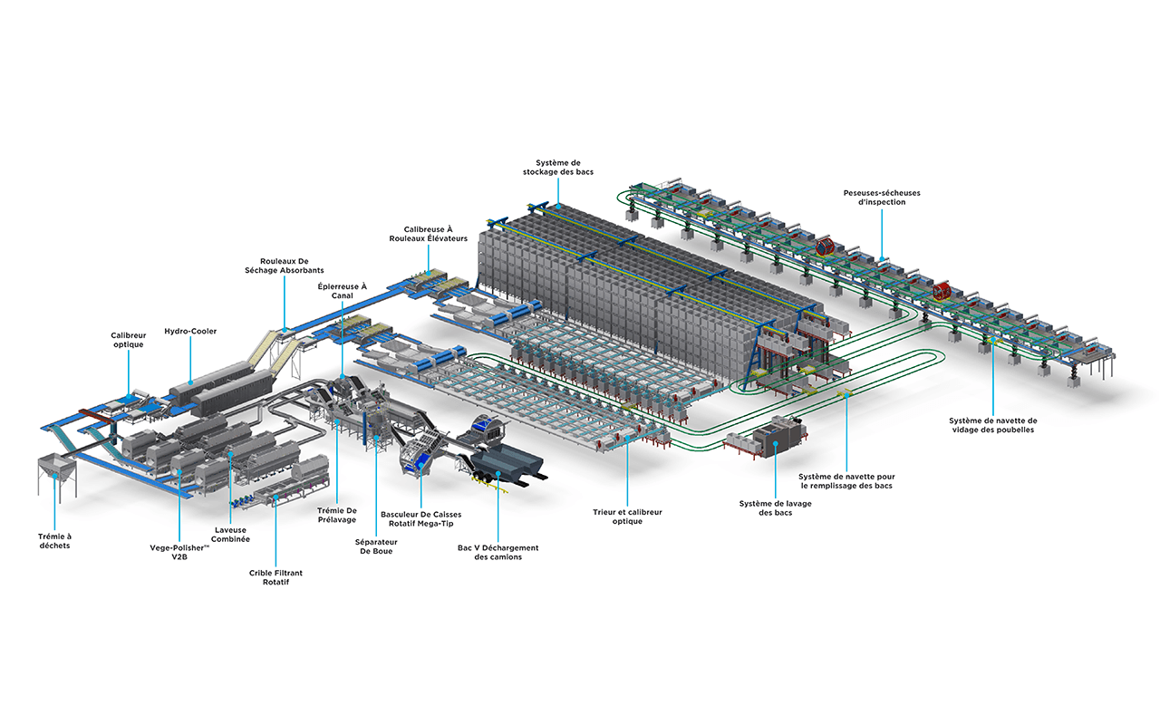 Cette ligne de pommes de terre de 90 tonnes démontre l'échelle et la complexité requises pour traiter et manipuler de grands volumes de produits. La réception est gérée par de grands bacs de stockage ou directement depuis les camions de récolte sur le terrain. Les pommes de terre sont ensuite trempées, épierrées, lavées et polies. Un grand réseau de canaux fournit la solution de transport à ce stade, soutenu par un grand système de recyclage de l'eau par filtre rotatif. Les pommes de terre sont ensuite acheminées, via une première calibreuse optique, vers une paire d'hydrorefroidisseurs. La réfrigération des pommes de terre est une méthode éprouvée pour prolonger la durée de conservation et, dans cet exemple, les pommes de terre réfrigérées sont calibrées et classées avec précision grâce à l'association d'un calibreur mécanique à rouleaux élévateurs et d'un système de classement et de calibrage optique pour une précision maximale.