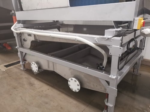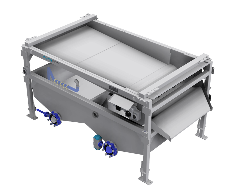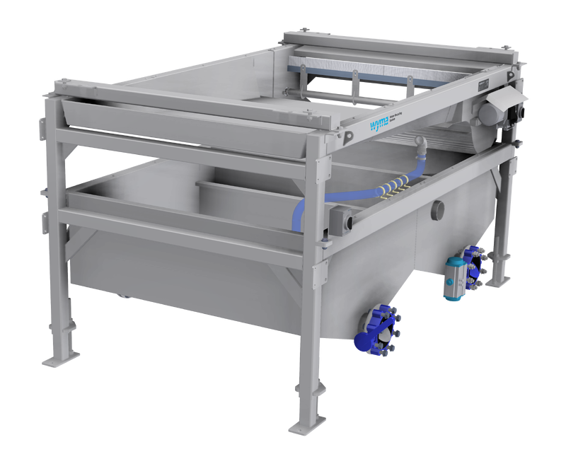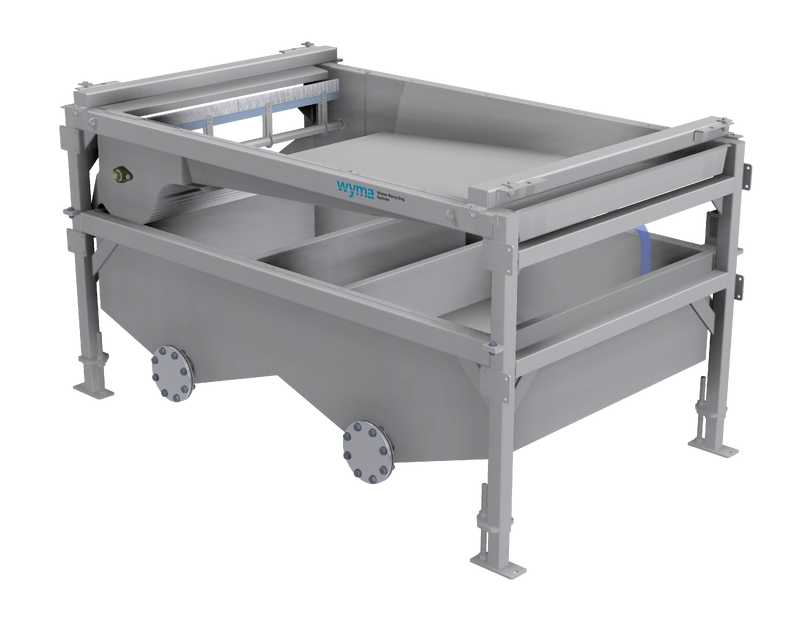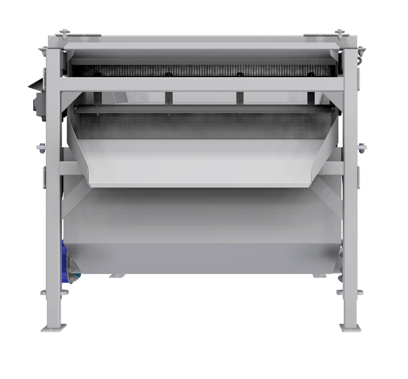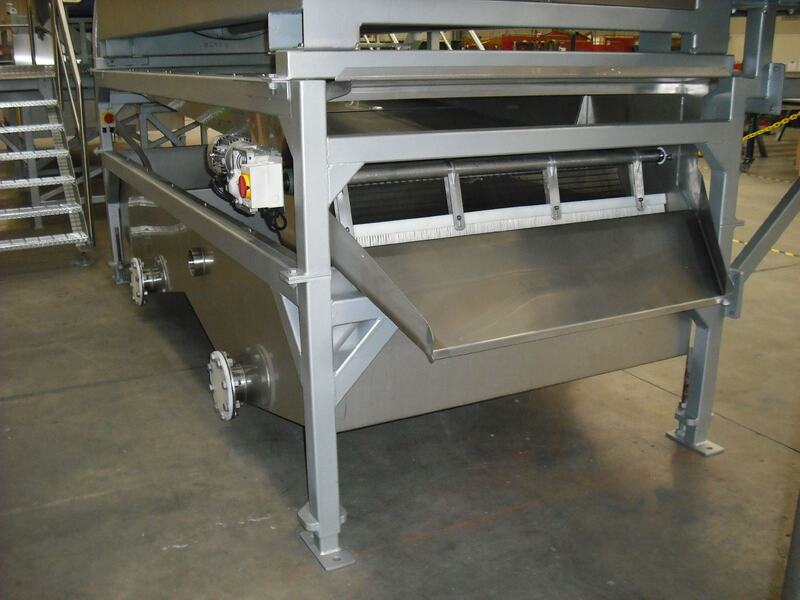 Process water is collected in the sloped catchment tray. There is a wedge wire screen at the lower end of the tray. Water falls through the screen into the tank below. Debris is caught on the screen and swept away by a rotating brush.