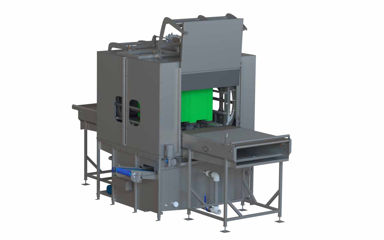 This system can easily be coupled with a bin destacker and stacker to create a complete bin wash line.
