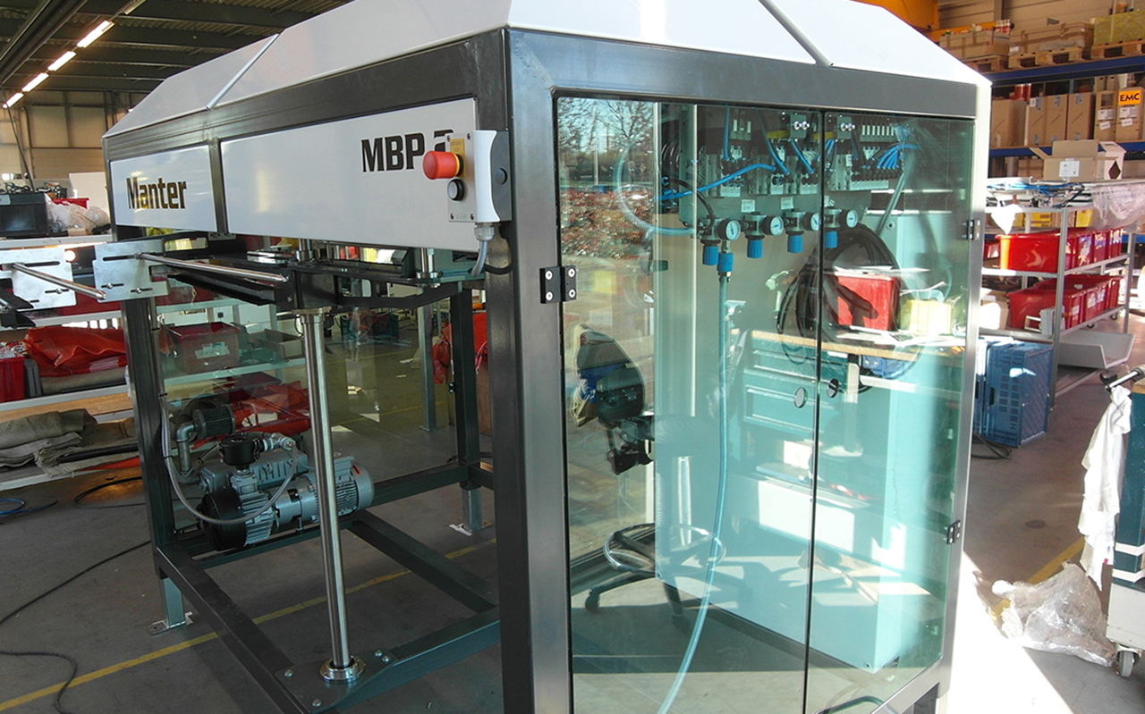 The Manter Bagplacer HS is for high-speed automatic placing of bags, with holes and plastic strip, under a filling hole.