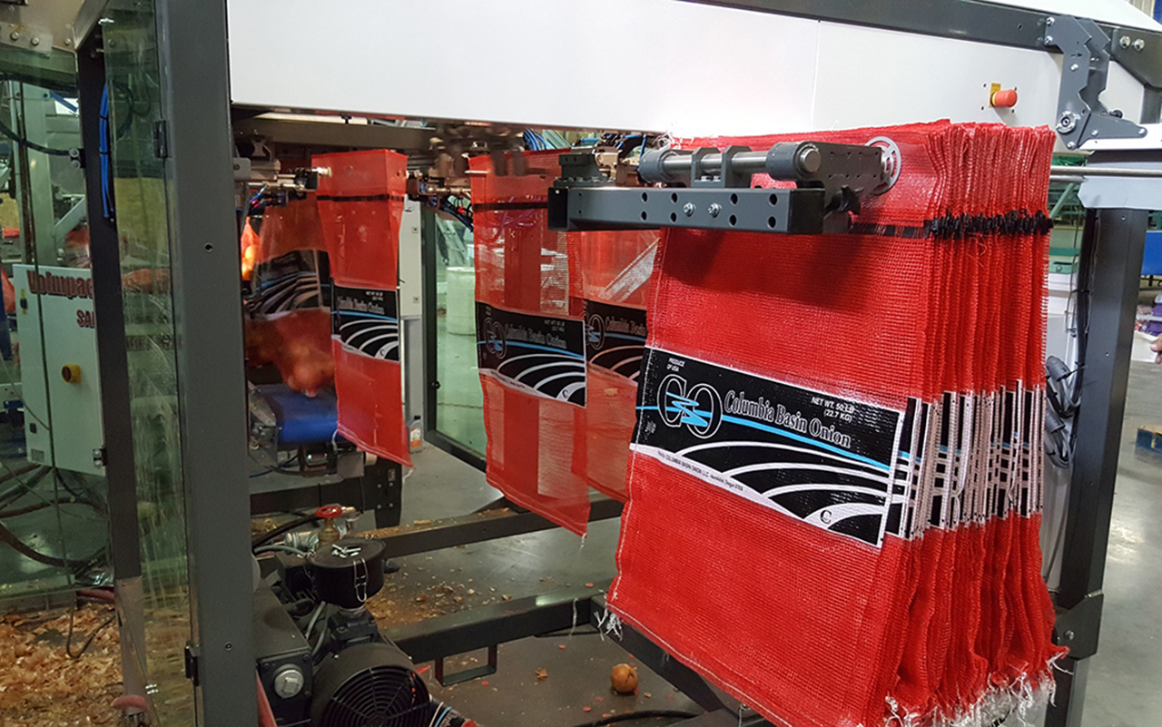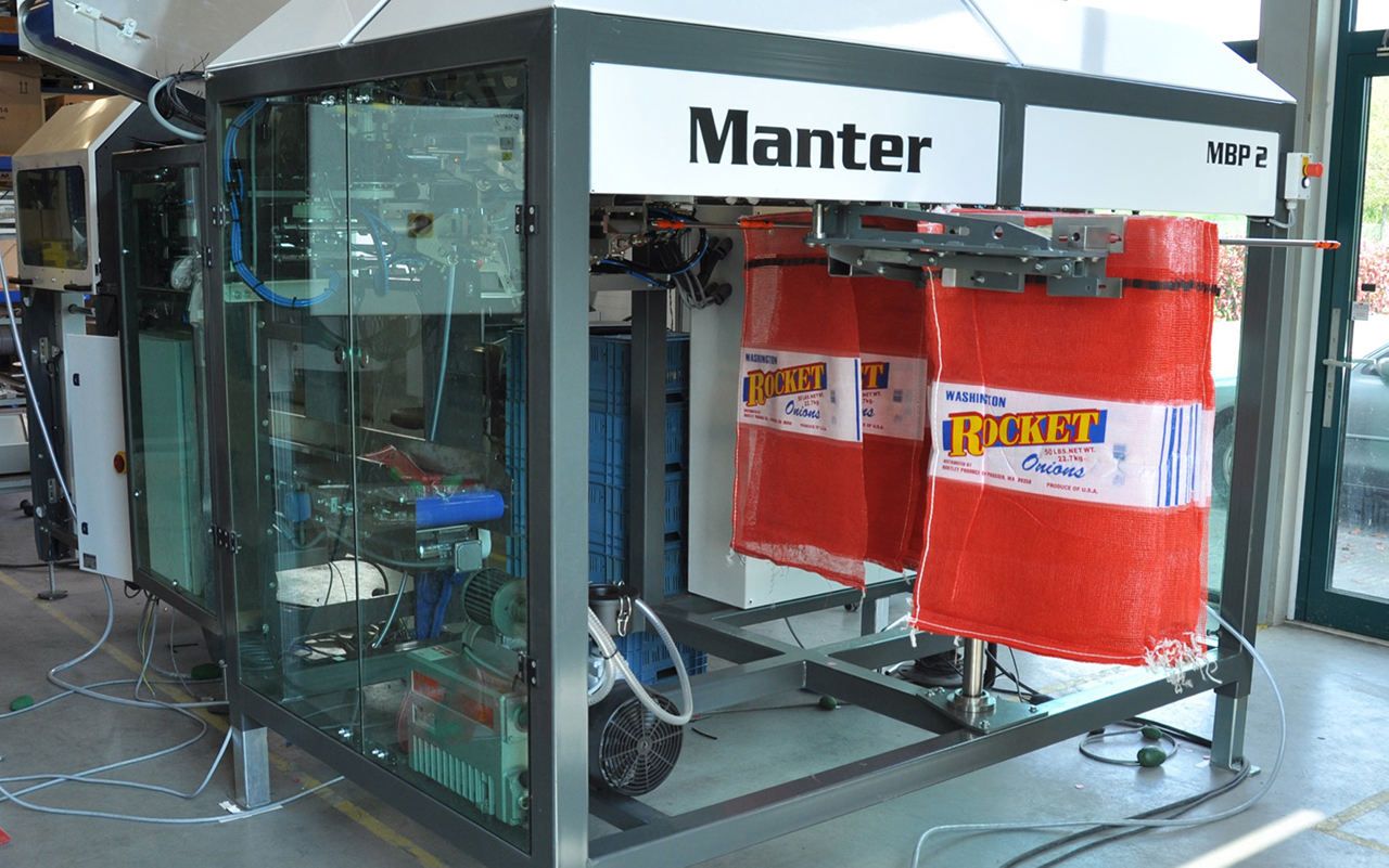 - High Speed automatically hanging of single net and hessian bags equipped with a plastic strip